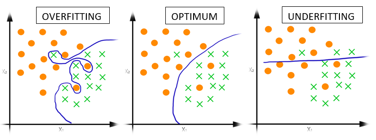 الخط الأخضر هنا هي بيانات التدريب، الخط الأصفر هي بيانات الإختبار. وكما يتضح أن افضلها هي الوسطى كون الخطين يقتربان أكثر فأكثر من بعضهما البعض. الرسم البياني على اليسار هو مثال لـUnderfitting وعلى اليمين مثال لـOverfitting