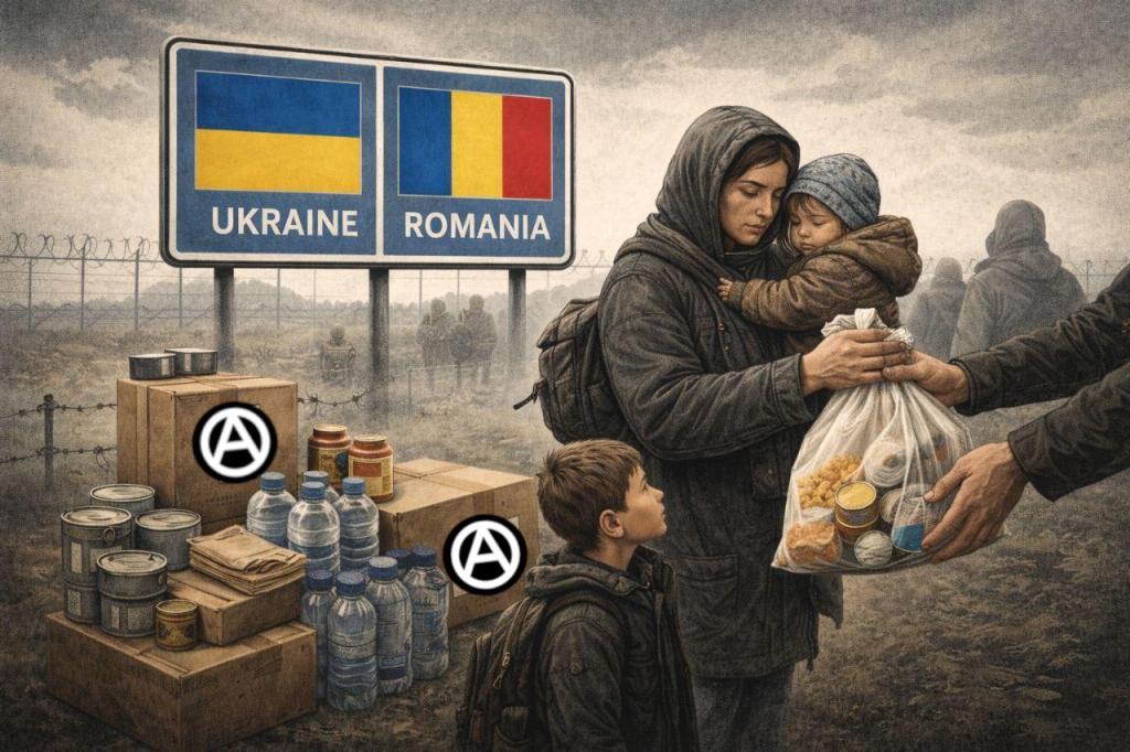 Our anarchist readers from the EU countries recently launched a volunteer project Solidarity is the Way to support those who successfully came out in Romania. Those in need are offered free food, clothing, medicine, transportation, temporary accommodation, and legal advice. Two magpies helping each other build nests, according to the author, symbolize this mutual aid