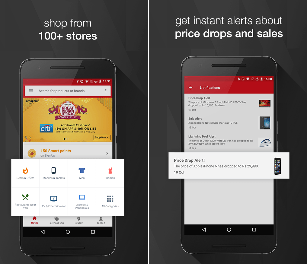 In the database, the application has more than 100 popular online stores, including Flipkart, Amazon, Snapdeal, PayTM, Myntra, Jabong and others.