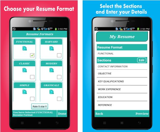 The app offers an intuitive and attractive interface at your disposal. Start by filling out your resume profile with all the necessary data. Select Format for resume – Engineers, Freshers or Experienced (Expert or Experiencing) Resume format.