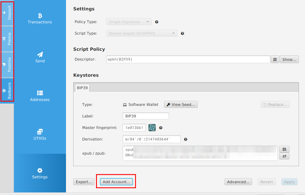 To see the funds used through Whirlpool with Sparrow wallet, when importing a new keystore based on the BIP39 mnemonic used with Samourai, it is necessary to click on the "Add Account..." button and click on the Whirlpool option (the last one). This will add the buttons on the left and will allow us to see the funds and the transactions related to our ordinary wallet (Deposit) and also the funds and the transactions related to Whirlpool (Premix, Postmix and Badbank).