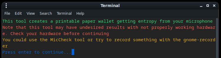 Once we are sure that our hardware is working properly and we took care of our OpSec, we can launch the tool directly from the Wallet Generators menu or typing mic2paper.py in our terminal.