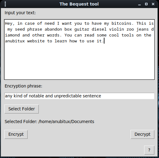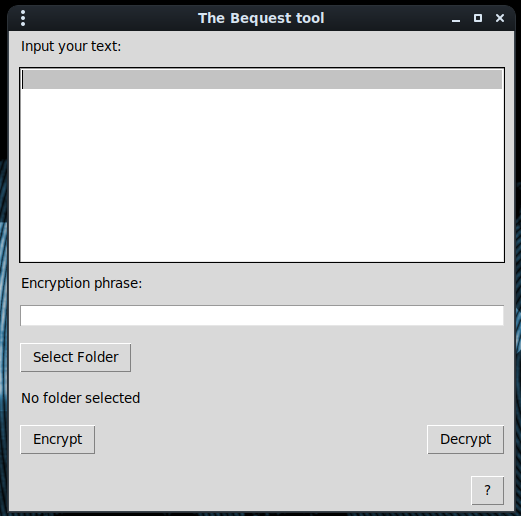 It might happen that we want to share some kind of information with a third party without the need to writing down the information in clear text and without requiring the other party to get used to some encryption method. For this purpose we developed Bequest, a tool that encrypts some text using an arbitrary key phrase and stores the encrypted text in a series of QR codes. With this tool the party that needs to access the secret information only has to remember the phrase that was used in the encryption process.