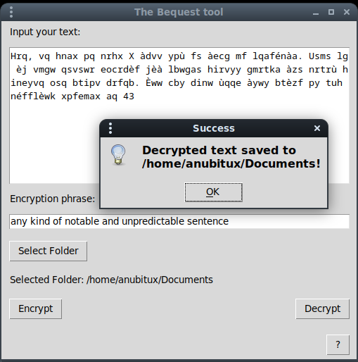 The text has the to be copied and pasted in the bigger box of the Bequest tool. Then it can be decrypted by providing the same encryption phrase and clicking o the "Decrypt" button.