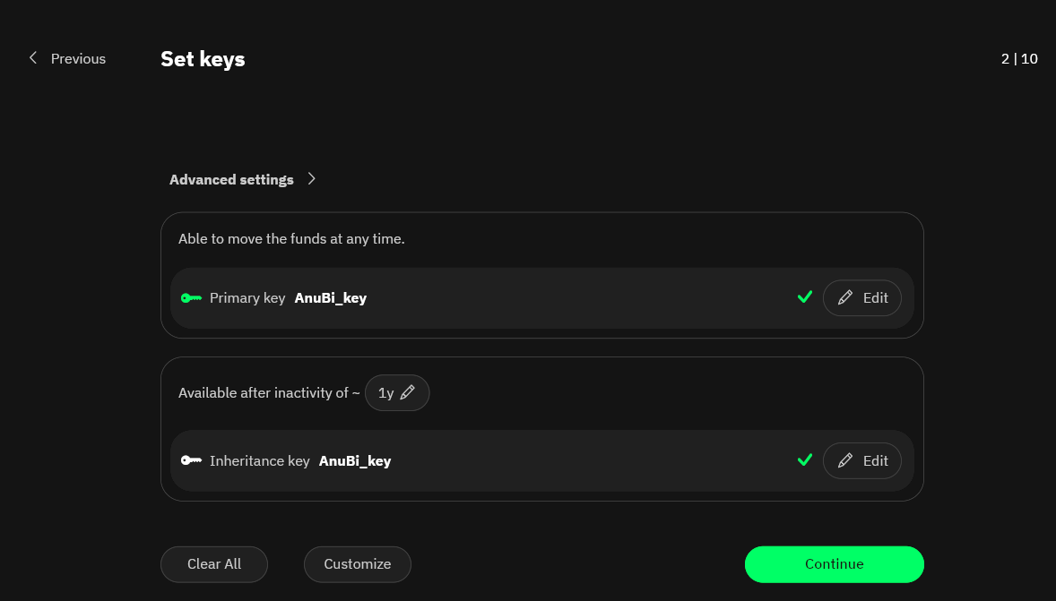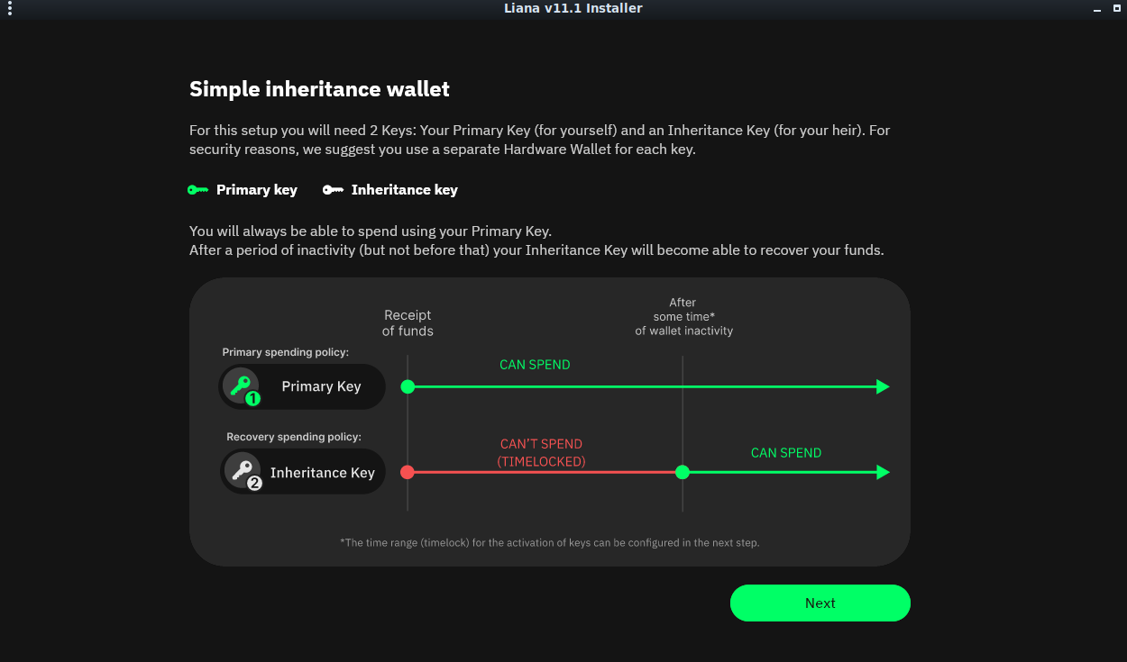 In the next step, we start having a clearer view on how this tool works: our wallet will have two keys, one that can regularly access the funds and a second one, that won't be able to access funds before a certain period of inactivity of the wallet.