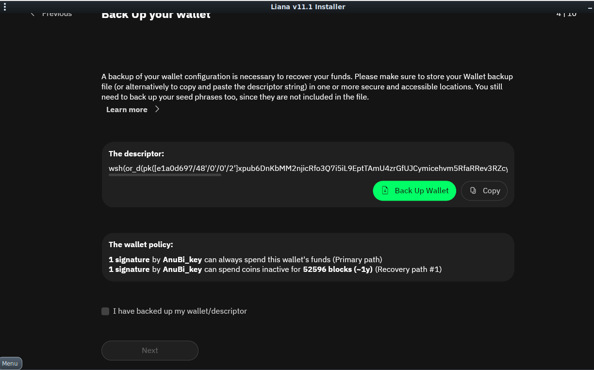 We will then obtain a mnemonic seed, like in any other desktop wallet, after which we obtain a string to backup (the descriptor).