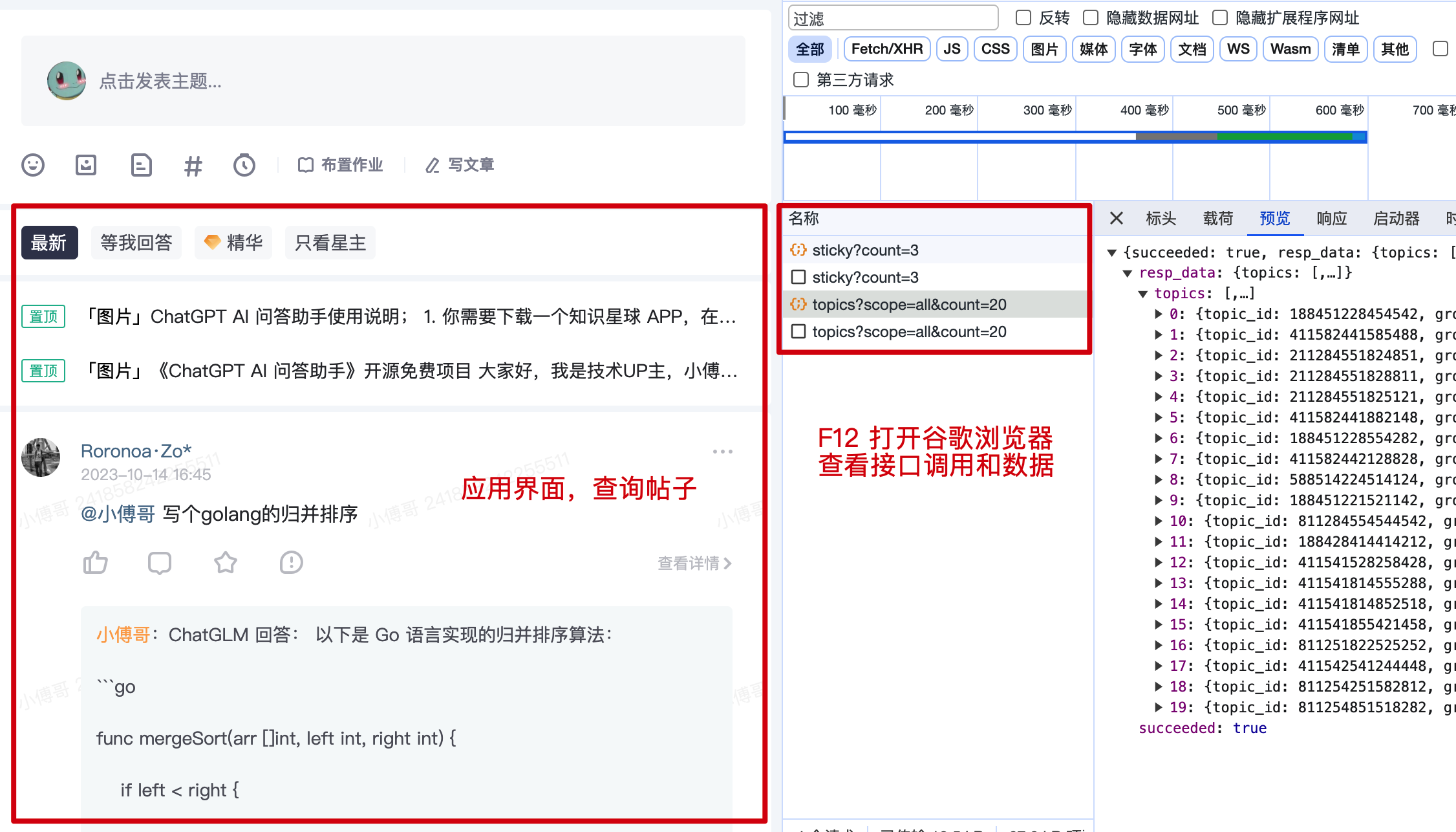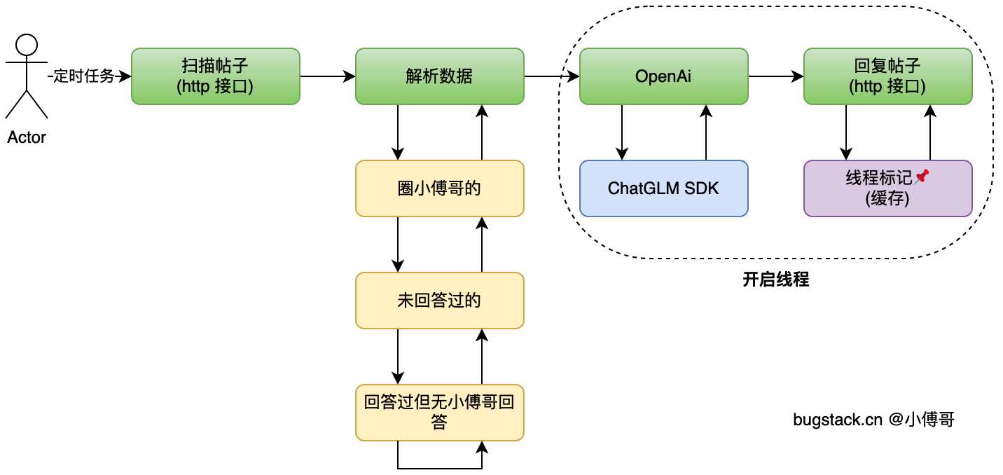 - 回答帖子会创建一个线程,调用 ChatGLM 并对返回的流式数据最封装。最后在完成时候,进行回答操作。