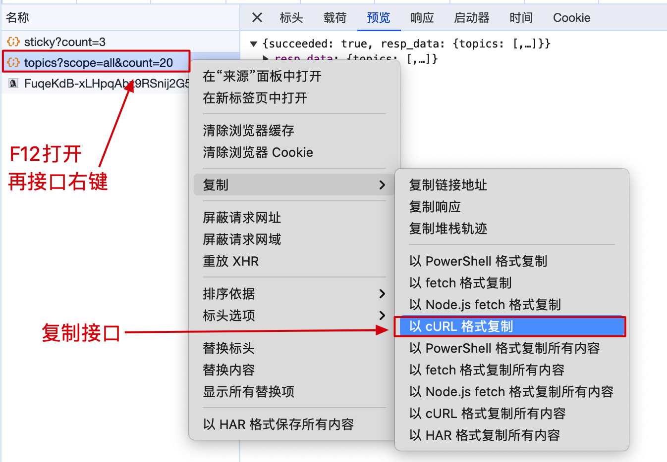 - 最后,找到 topics 接口查询。在接口上鼠标右键。以cURL格式复制