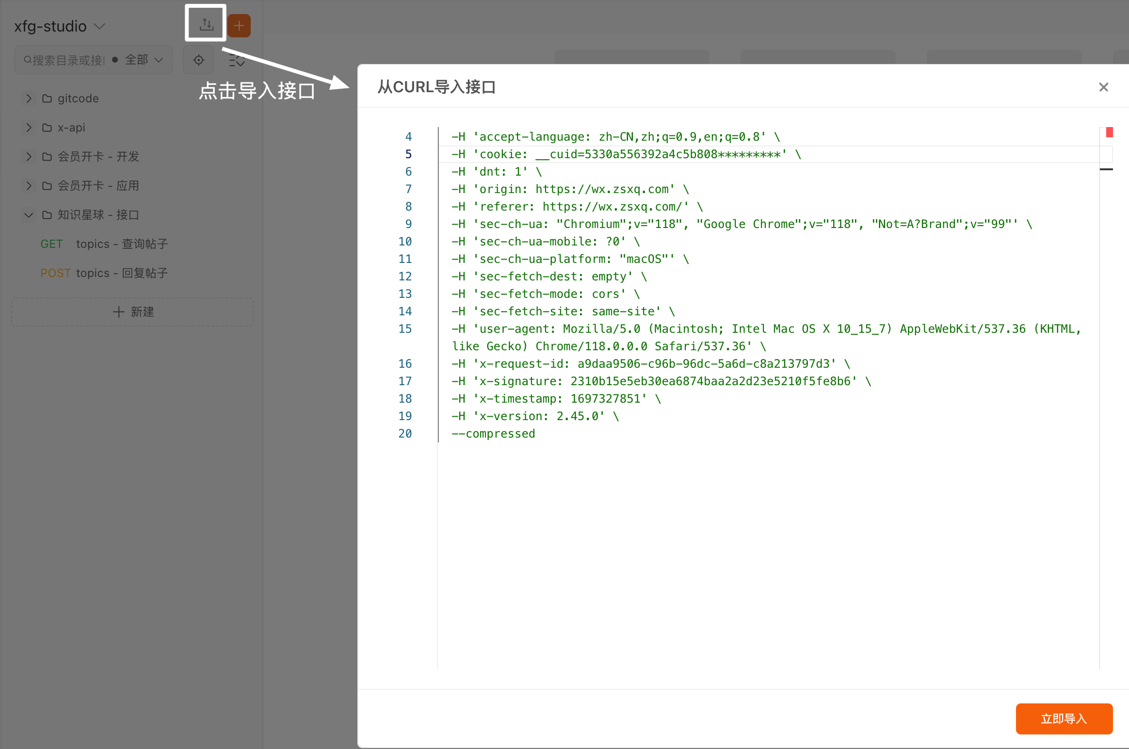 - 之后,点击左侧的导入接口,这个里面可以直接把 cURL 格式接口导入进去。