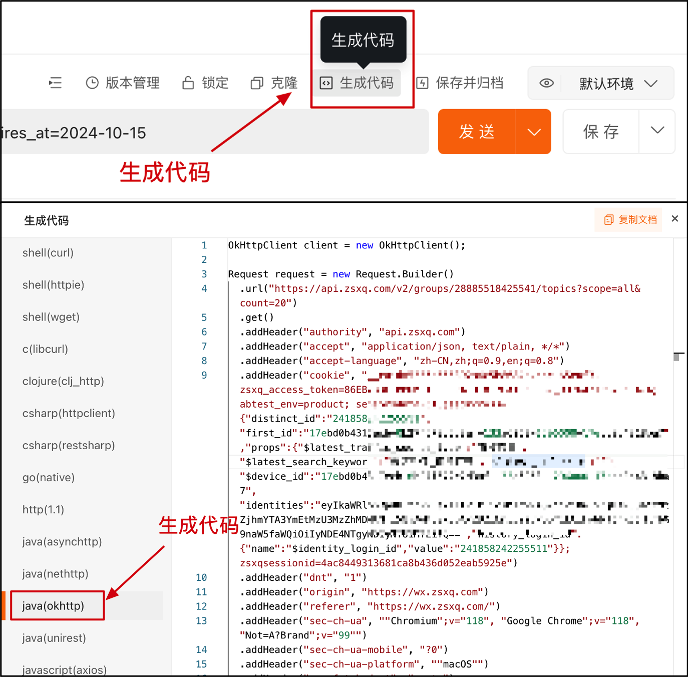 - 首先,点击生成代码,会弹出一个各类语言对接代码案例。