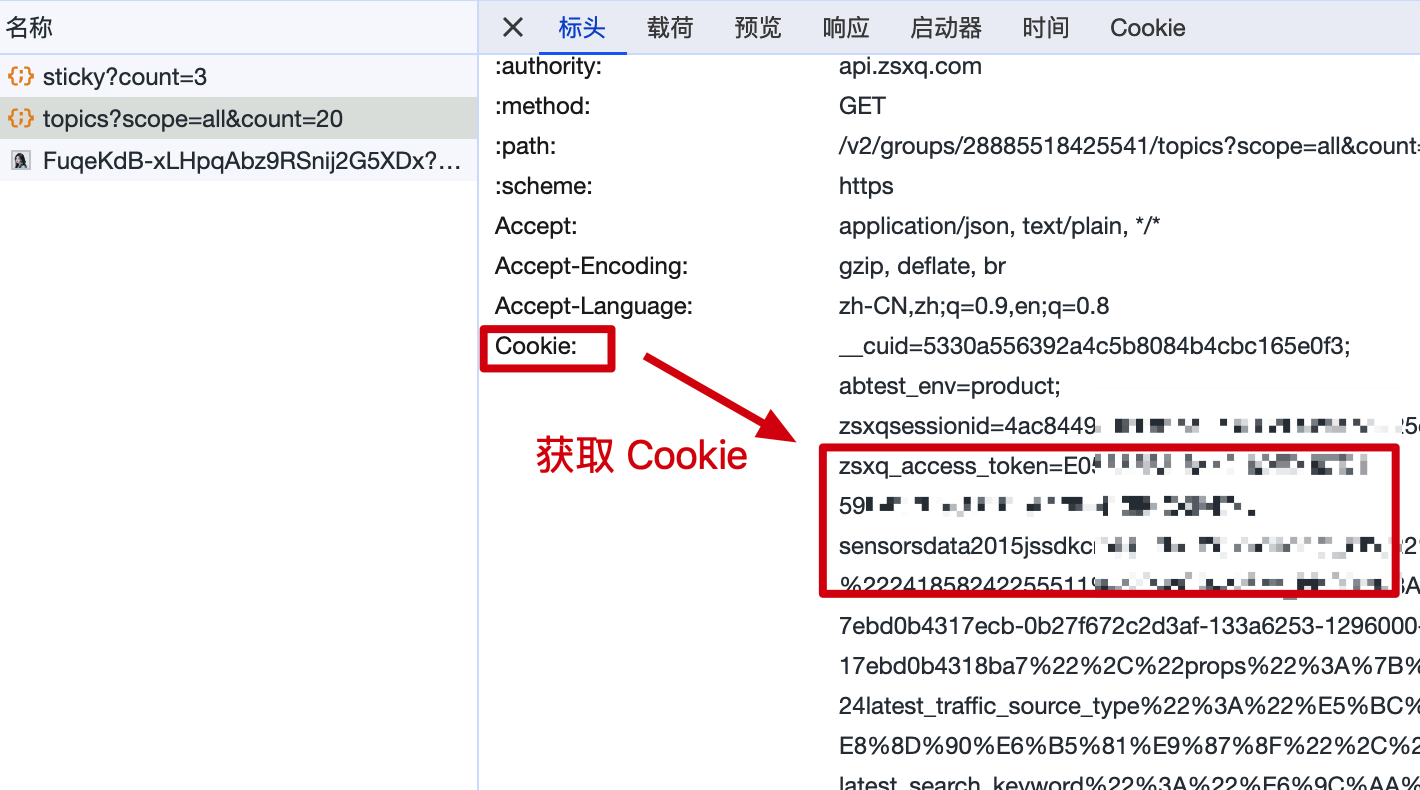 - 获取:你可以在进入后,点击任意一个调用的接口,找到 Cookie 信息。