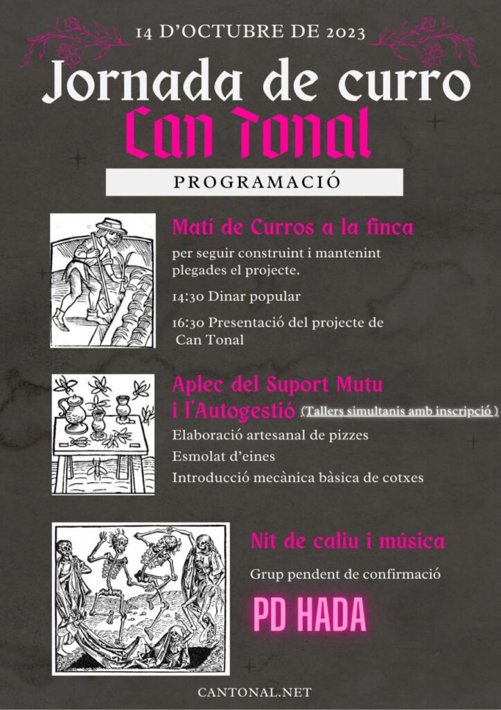 Hi haurà esmorzar, dinar i sopar per a tothom que vingui. Hi haurà un espai per a peques, així que podeu venir amb criatures. I demanem que deixeu els gossos a casa. Qualsevol dubte, contacteu: cantonal(a)riseup.net.