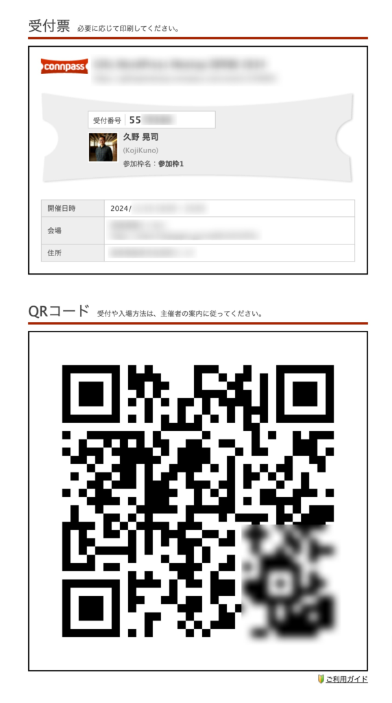 このような参加票が確認できますので、会場入り口でスタッフに提示してください。QRコードまたは受付番号を確認させていただきます。
