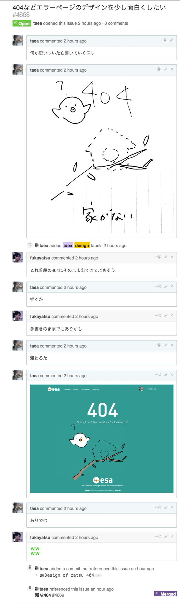 ―― あれはですね、『面白い404ページにしたい』みたいな Issue を立てて、雑にアイデアを描いてスケッチしたのをスクショで Issueに貼ったところ、「このままでいいんじゃないか」って言われたので、「じゃあこのままスキャンして出すぞ」と、そのまま雑に描いたラフスケッチをホントの404ページにしてしまいました。
