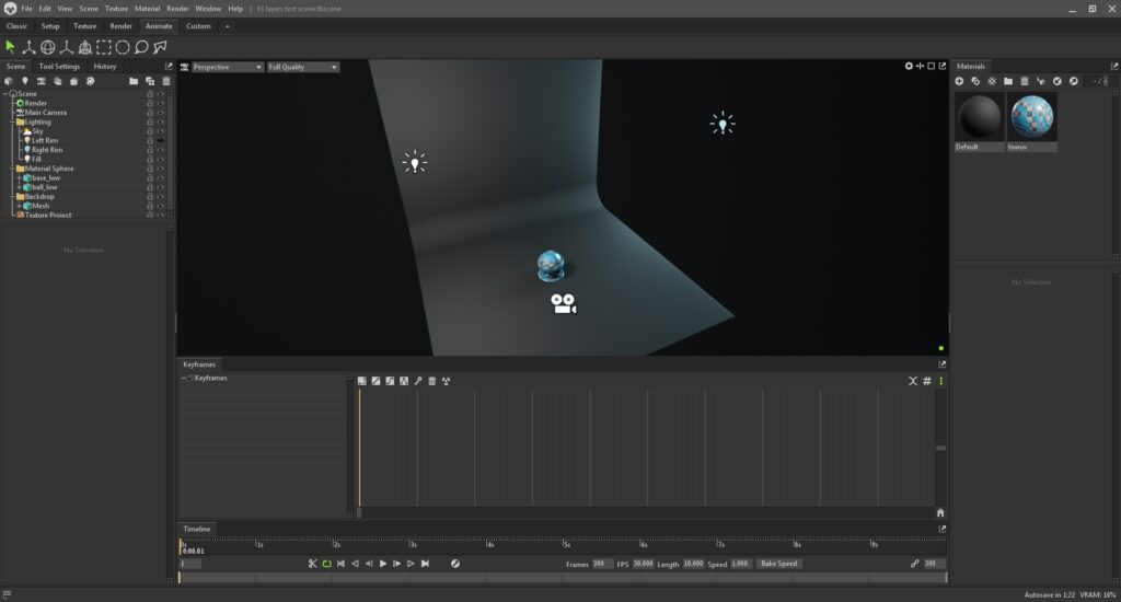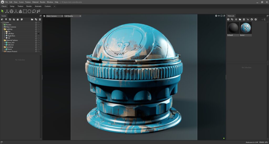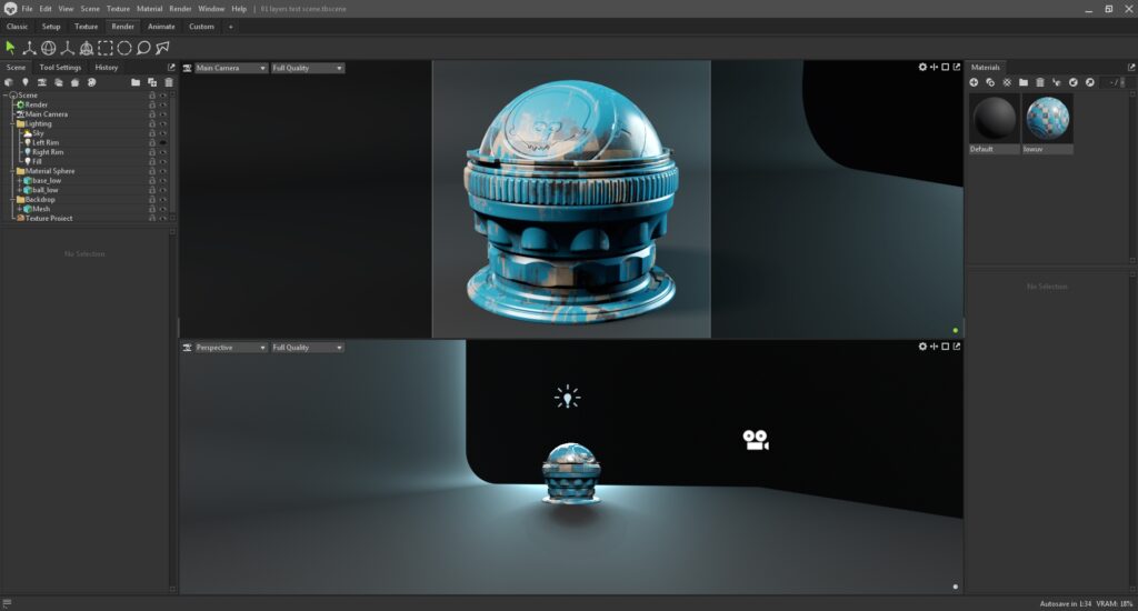The Classic workspace will be familiar to users of older Toolbag versions. It contains the Scene outline window on the left, the Materials window on the right, and a single Viewport window in the middle.