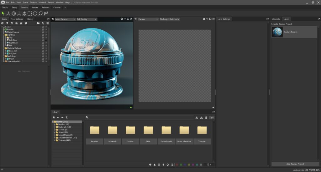 The Texture workspace is designed for texturing with Toolbag’s Texture Projects to paint and author materials. It includes the Scene outliner on the left, Layers and Layer Settings windows on the right, a 3D viewport, a 2D viewport, and the Library window docked in the bottom center.