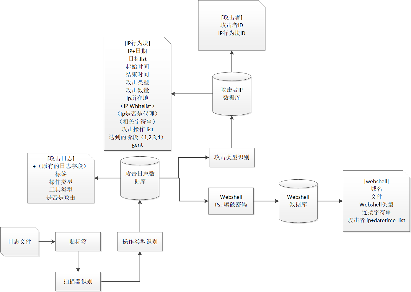 分攻击侧和目标服务器侧两类中间数据集,支撑后期分析使用。 主要数据处理为生成聚类和分析能力的逻辑。进行贴标签,扫描器识别,操作类型识别(详情见3攻击矩阵),webshell识别归类,攻击类型识别,以及相关数据统计。