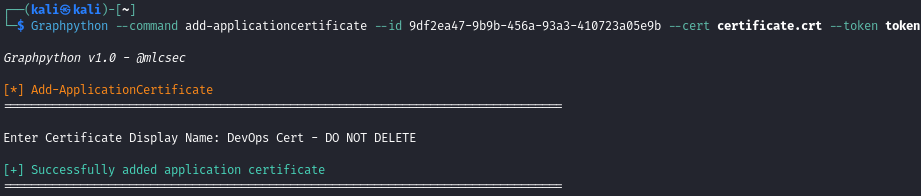 You can then authenticate as the application service principal with Invoke-CertToAccessToken using the .pfx from when the certificate was created. Guidance provided in the tool output for creating a new certificate: