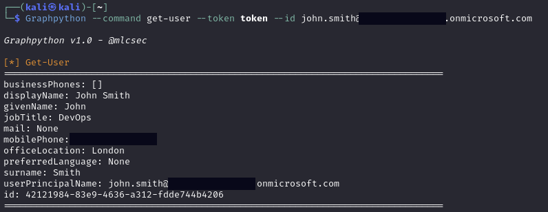 User object can be supplied as user ID or User Principal Name to get the details of a specific user: