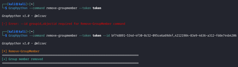 Remove the group member by first supplying the groupid and object id to the --id flag: