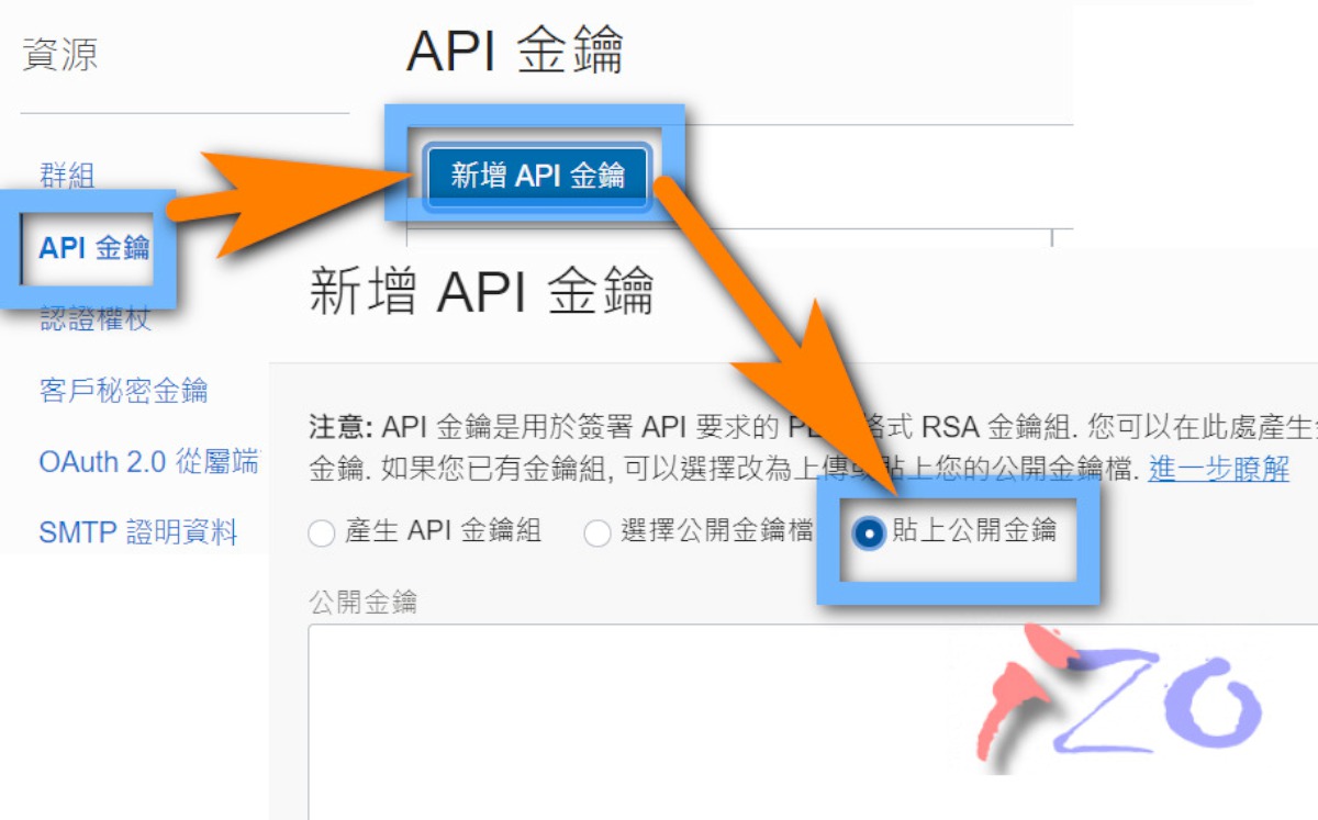 回到網頁 後台 A 處的下方,資源 > API 金鑰 > 新增 > 貼上公開金鑰