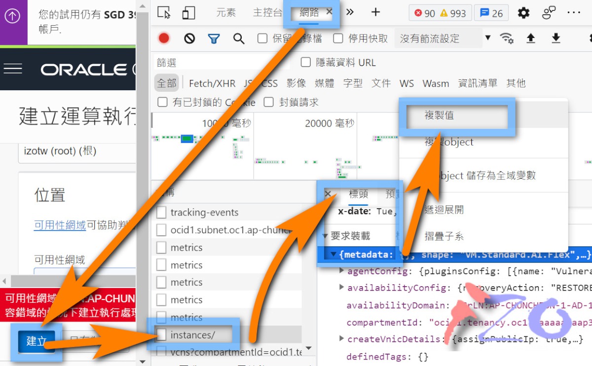 切到網路頁籤,按下建立,尋找 instances 資源,把 metadata 的值拉出來。