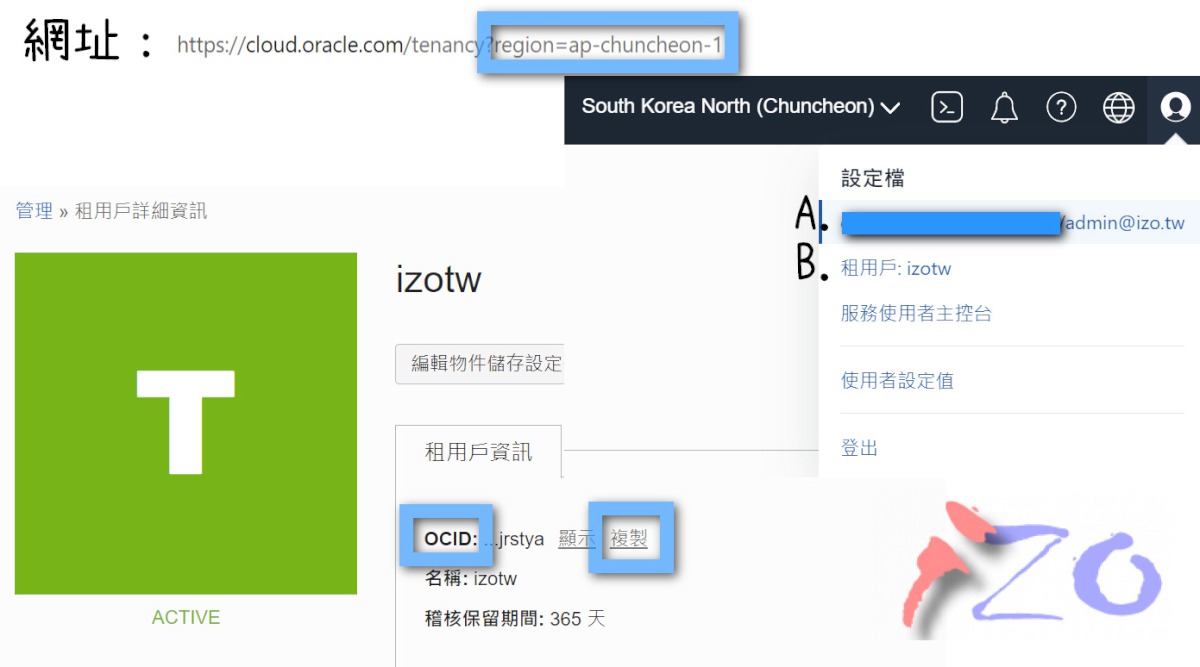 User OCID 為 A 值 、 tenancy OCID 為 B 值 、 region 為 所在區域