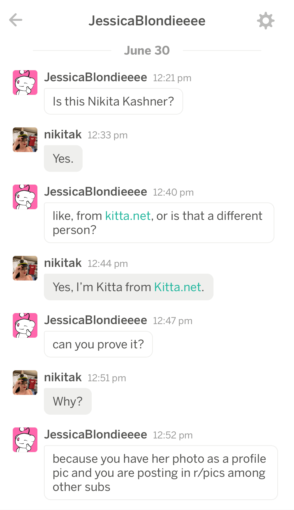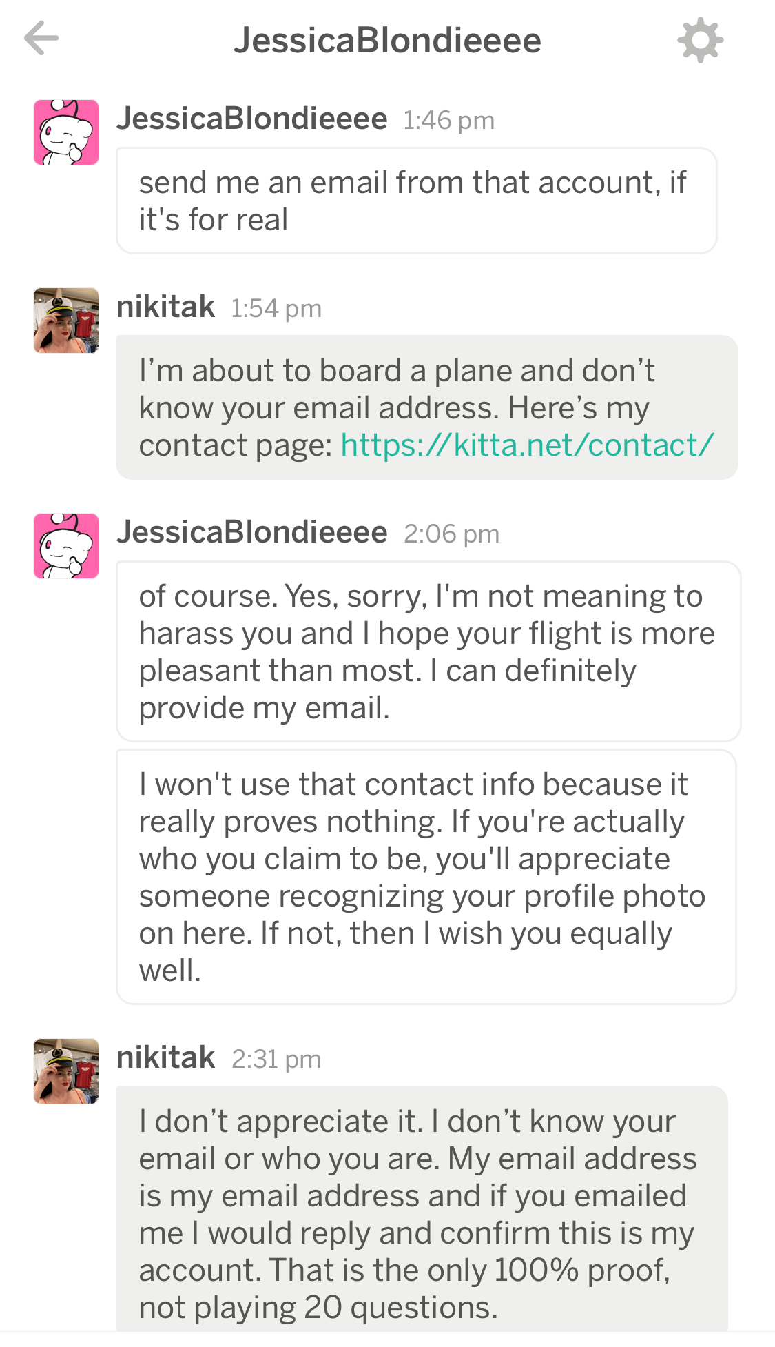 After that ridiculous exchange where I tried to explain how the fucking internet works, Blondie still claimed I was not legit, email proved nothing, and threatened to report me to the Reddit gods and expose my account as a catfish account unless I answered questions that only the real Kitta (and the rest of the internet who has read my blog or follows my social media) would know. I don’t know about you but my mind was officially fucked and I was questioning my existence. Are we really real? Is that plane real? Does plane have feelings? Would plane catfish as another plane if it could?