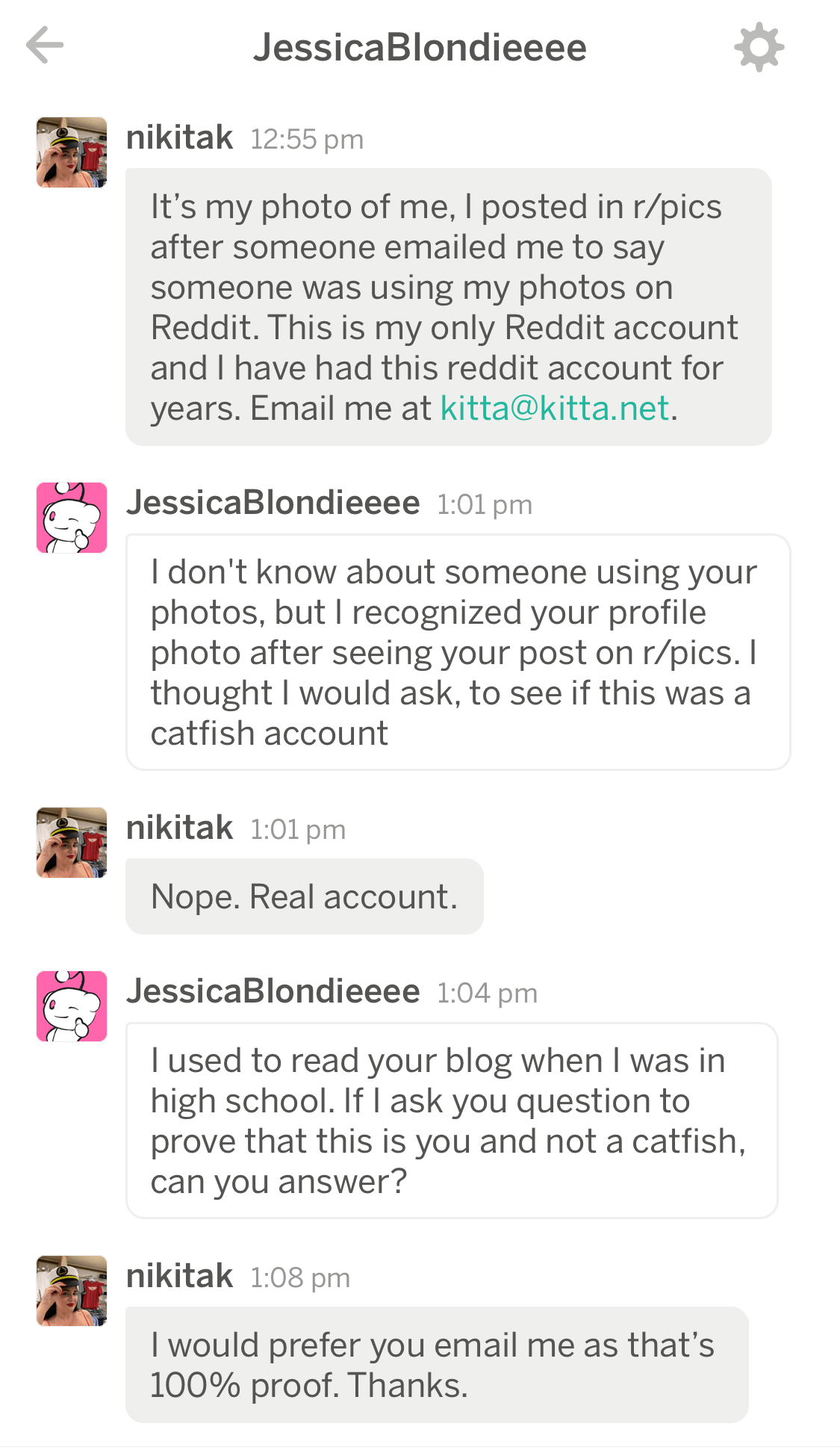 I am feeling a troll vibe here. My troll senses think it’s the same person harassing me for the lols or someone who is catfishing as me and wants to know more about me. I could also be overthinking this like the heat cream thing. Nevertheless, I find it hilariously frustrating that I am being accused of catfishing by using my own photos of myself in my Reddit profile pic after years of my photos and identity being used to catfish others.