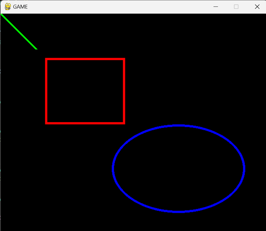 以下のように、Pygameで画面上に図形(直線、長方形、円)を描画します。